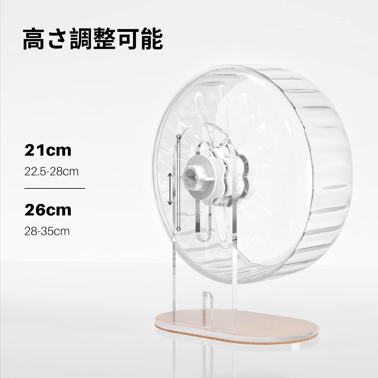 【ホイールサイズ】21cm ;走行面サイズ8cm;全体高さ:22.5-28cm;ベースサイズ:22 x 14cm;総重量0.68kg。ベースサイズ:22 x 14cm。スタンドは高さを調整でき、底部滑り止めのコルクパッド付き、ホイールがより安定します。ジャンガリアンハムスター、ロボロフスキーハムスター、キャンベルハムスター、チャイニーズハムスターなどの小型ハムスターに適しています。もし商品に不具合や使用方法が不明な場合は、遠慮なくご連絡頂きますようお願い致します。