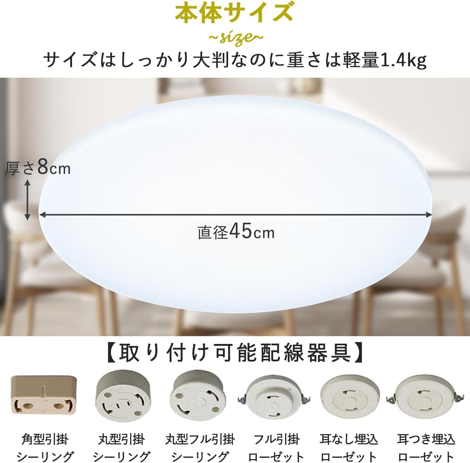 【商品仕様】▪商品サイズ:直径45×高さ8cm ▪商品重量:1.4kg ▪消費電力:27W ▪器具光束:3600lm ▪待機電力:0.2W ▪モジュール設計寿命:約40000時間※モジュール寿命は、LED が点灯しなくなるか、光束が70%に低下するまでのいずれかの短い時間を推定したもので、製品寿命をするものではありません。 ▪期間:お買い上げ日より1年間(の範囲については、取扱説明書をご確認ください。(一般家庭用以外(業務用など)に使用された場合の故障及び損傷などは対象外となります))