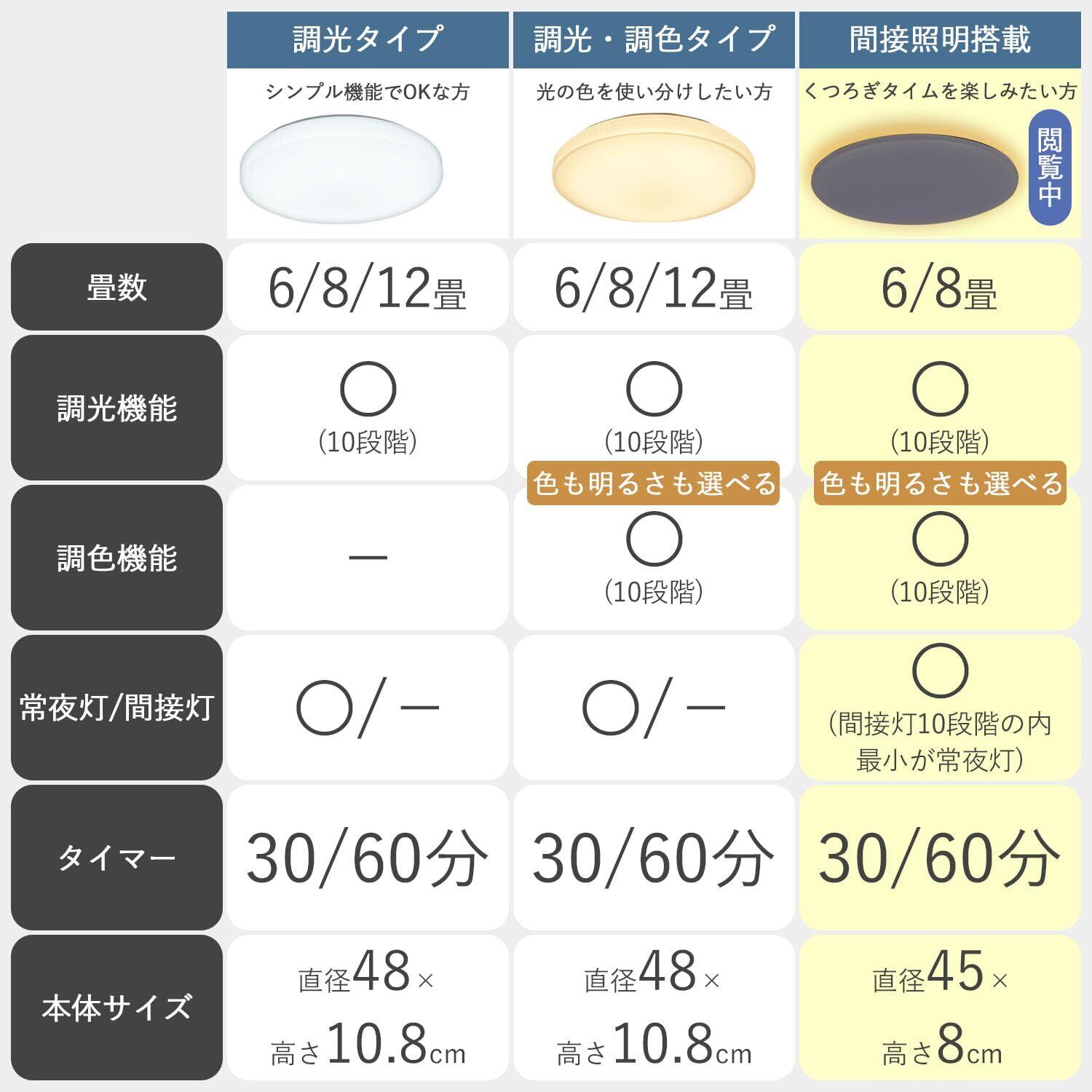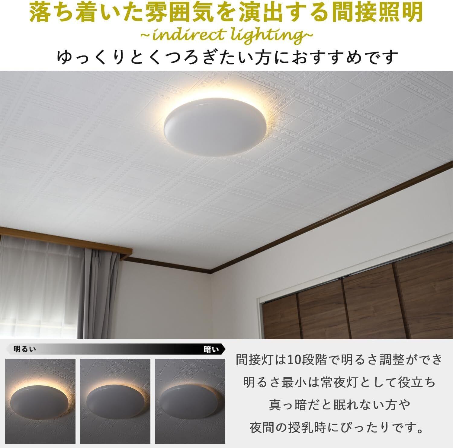 【利用シーンに合わせた明るさ・光色を】利用シーンやその日の天気によって10段階で選べる調光・調色機能、さらに天井をやわらかく照らす間接灯も搭載しております。間接灯の最小の明るさ常夜灯としてご使用いただけます。また、2パターンの点灯状態を記憶できるメモリ機能がついているので、ワンタッチでお好みの明るさに点灯できます。