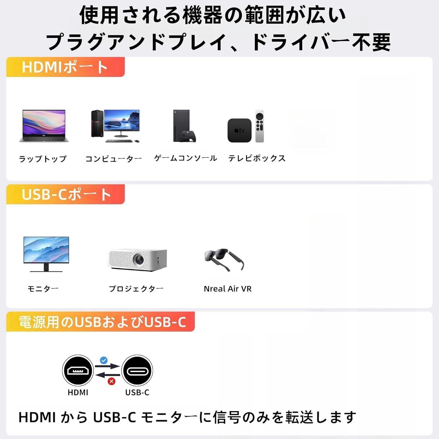【使いやすさと便利さ】このHDMI to USB C変換ケーブルはプラグアンドプレイの設計であり、ドライバのインストールや追加のソフトウェアは必要ありません。また、追加のケーブルも必要ありません。この製品のUSB-C側にはUSB-Cハブ、USB-Cドッキングステーション、またはUSB-Cドライブを接続しないでください。