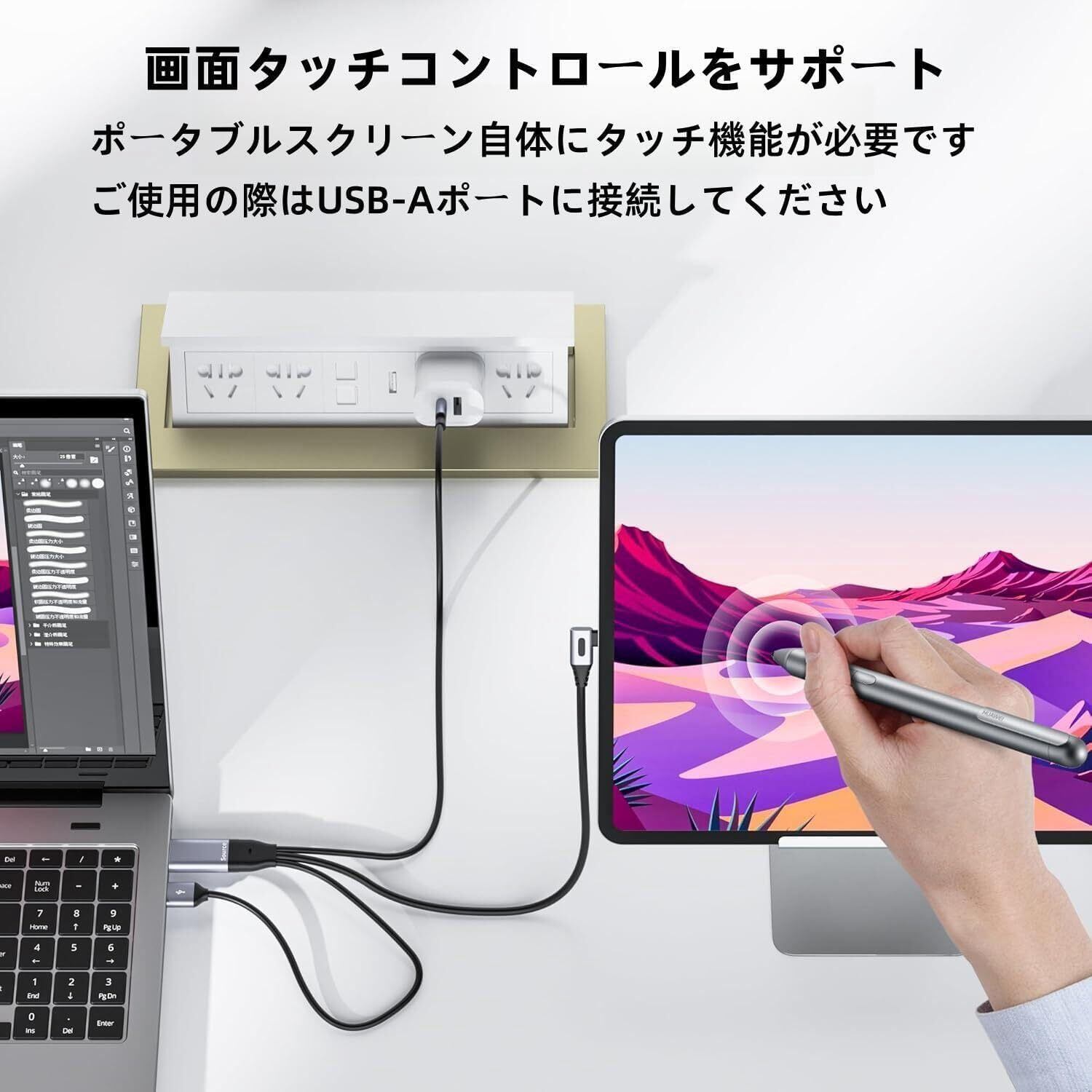 【多機能設計】このHDMI to type-C 変換ケーブルはHDMI信号の伝送だけでなく、USB-A電源ポートとUSB-C電源ポートも搭載しています。USB-A電源ポートはHDMI to USB-C 変換ケーブル内のチップに電力供給を行い、タッチパネル機能をサポートすることができますご注意ください(USB-Aポートに接続しないとタッチスクリーン機能は使用できません)USB-C電源ポートはUSB-Cインターフェースに接続されたデバイスに電力を供給します。ご注意ください(USB-C供电端口の出力は5V2Aです)