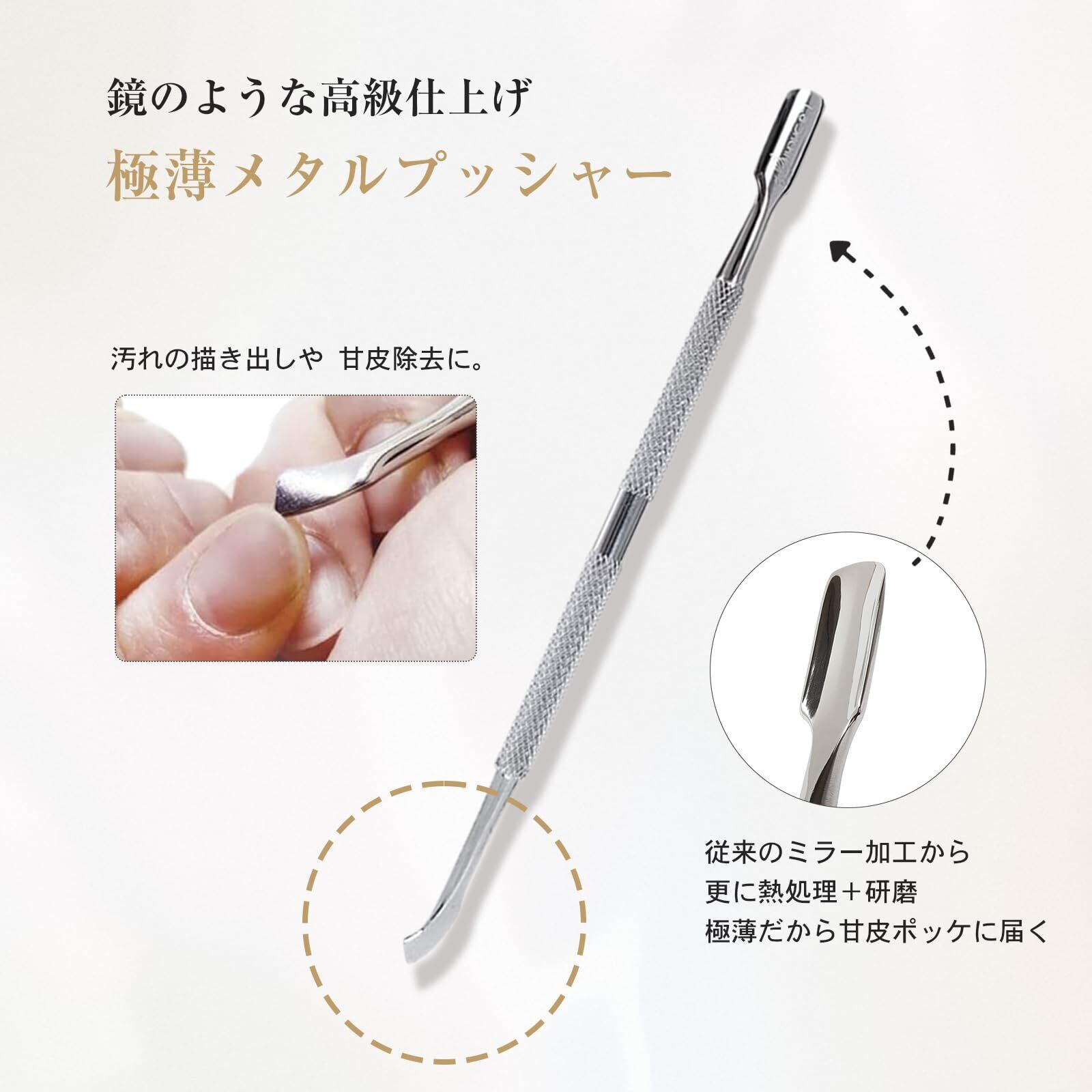【キューティクルプッシャー 】甘皮押しと掻き出しの2つの機能も持たせ、手仕事による厚み1/3の極薄に仕上げました。これにより今まで届きにくかった甘皮ポケットを押し上げる作業が簡単になり、爪とジェルの間の隙間を無くすことで取れにくい ジェルネイル を実現できます。反対側の扇形は取れたルースキューティクルを掻き出し、爪の間に蓄積した汚れを取り除く際にお使い下さい。薄い分、奥に溜まった汚れを簡単に取ることができます。