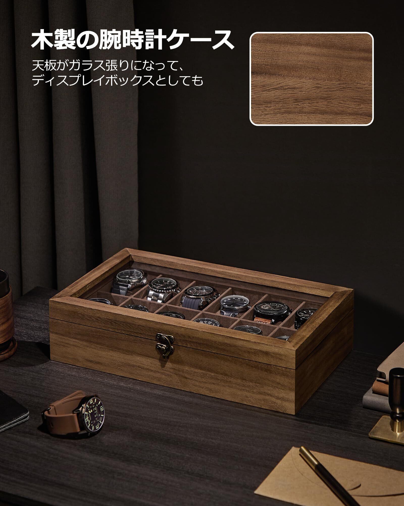 SONGMICSの時計ケースは、最大12本の腕時計をしっかり収納できる木製のコレクションケースです。透明窓付きで、愛用の時計を一目で確認できるため、毎日のコーディネートに時を刻む大切なアイテムをサッと取り出せます。