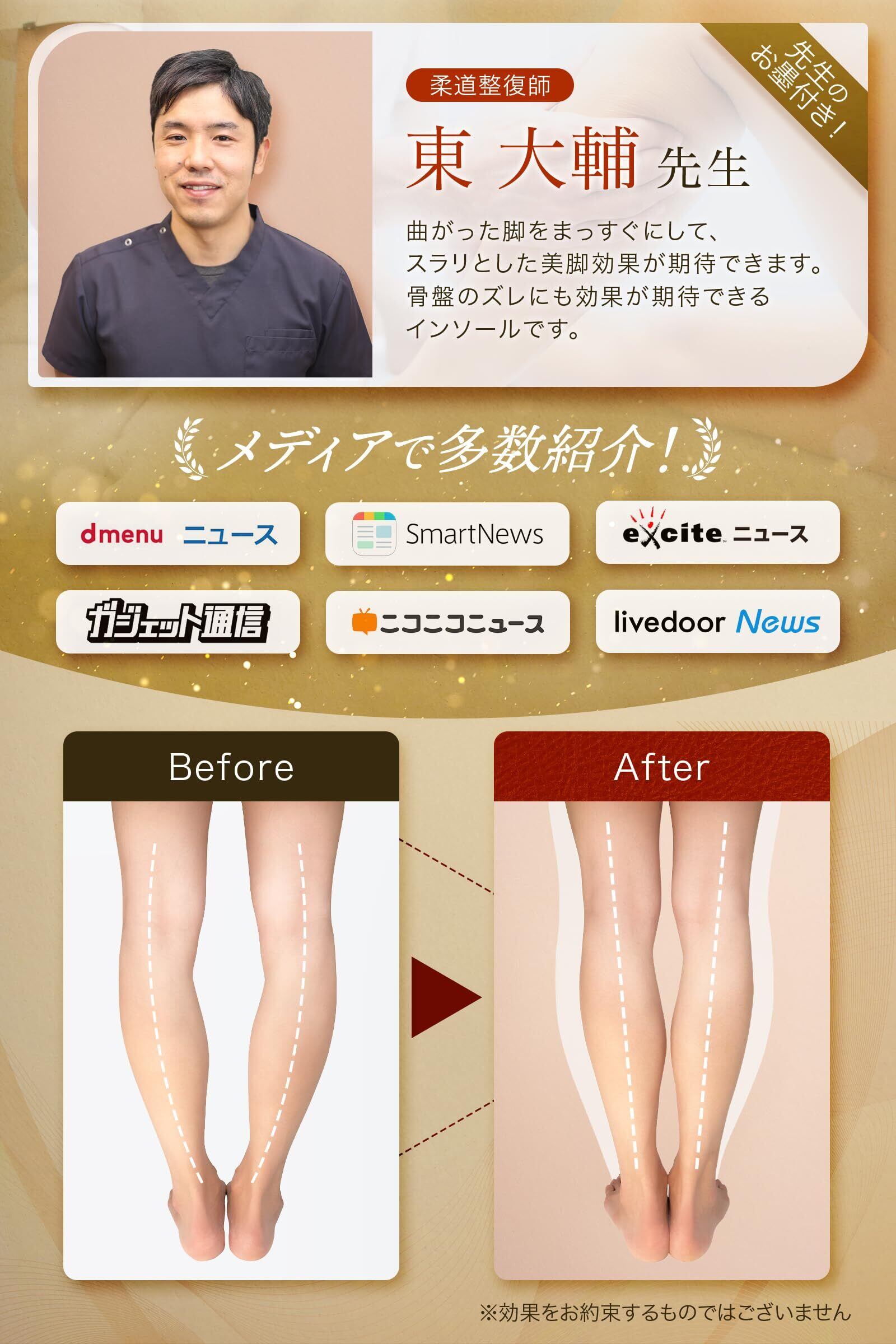 【先生のお墨付き】骨と関節のスペシャリスト、柔道整体師(国家資格)が監修し認めた逸品です!「曲がった脚をまっすぐにして、スラリとした美脚効果が期待できます。」「O脚矯正だけでは無く、骨盤矯正にも間違いないインソールです。」と自信をもって勧めています。