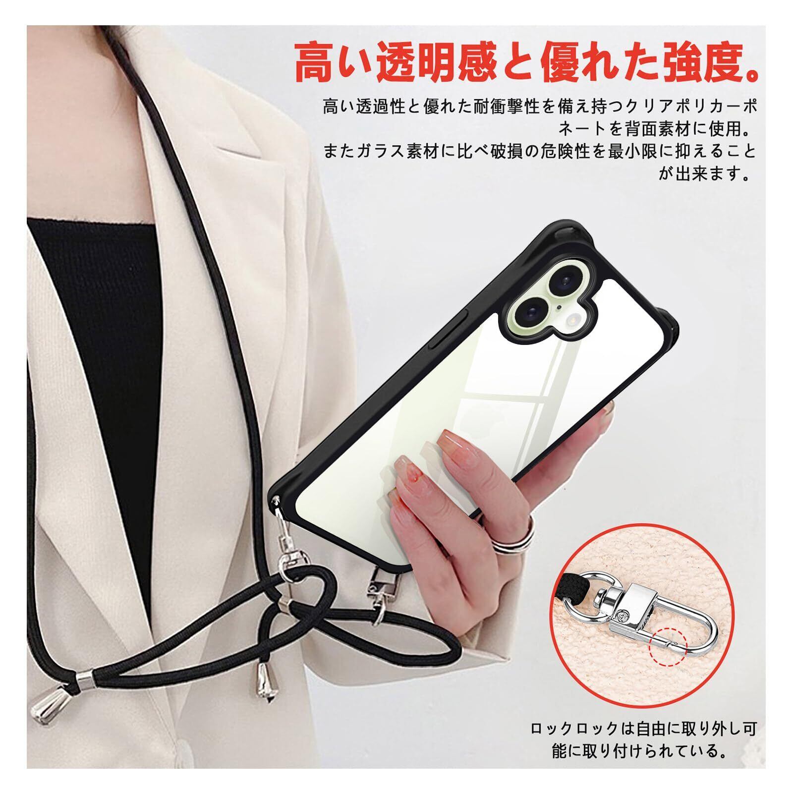 iPhone 16 用 ケース クリア ショルダー アイフォン16 カバー 肩掛け 斜めかけ いphone16 スマホケース 縄掛けケース 透明 PC 薄型 軽量 耐衝撃 紐付き 斜めがけ 落下防止 紛失防止 ワイヤレス充電対応 取り外し可能 調節可能なショルダー(ブラック)