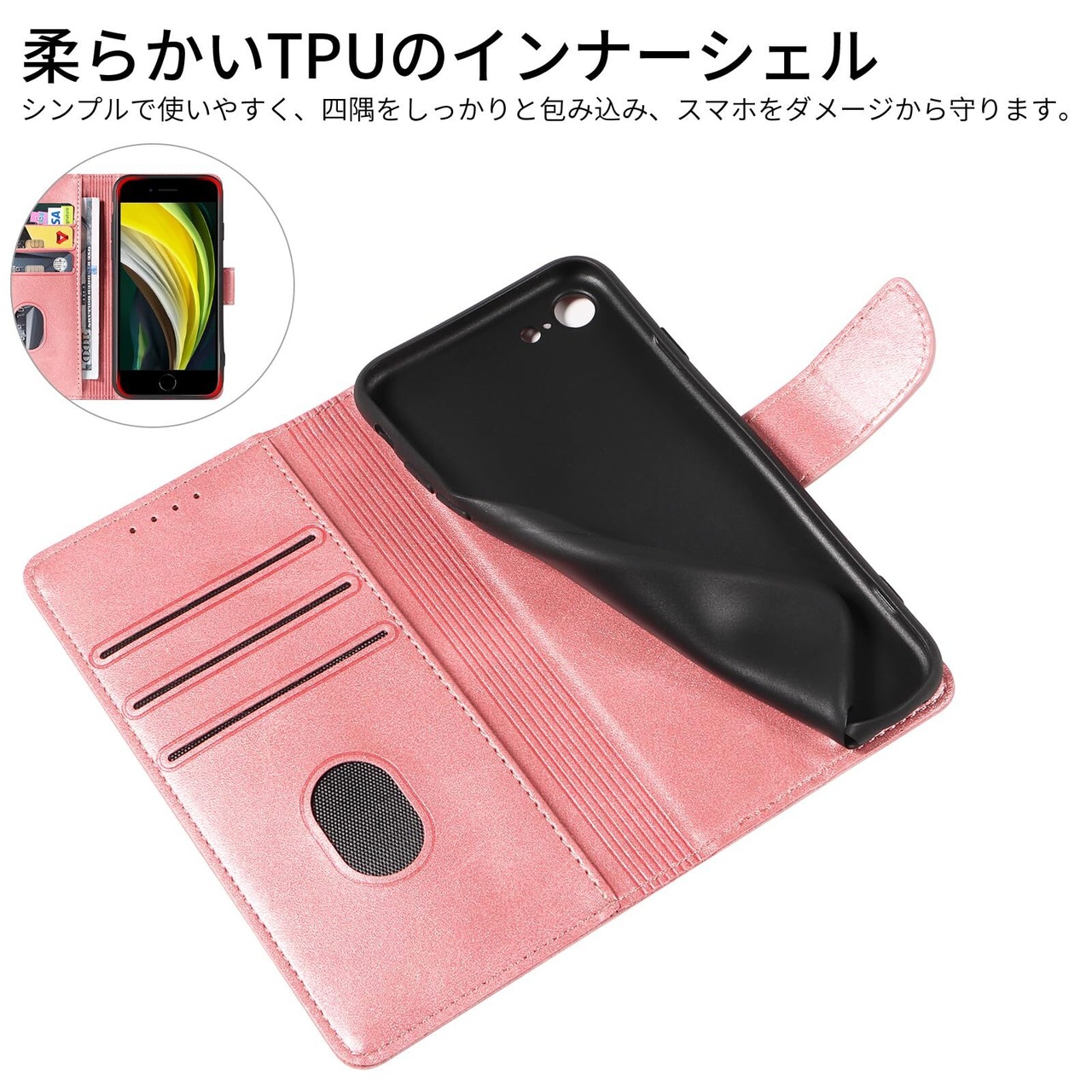 iPhone SE ケース 手帳型 第2世代 第3世代 スマホケース iPhone 8 7 携帯カバー レザー 軽量 薄型 耐衝撃 耐摩擦 全面保護 マグネット式 カード収納 スタンド機能 4.7インチ対応(バラゴールド, iPhone8 iPhone7 iPhone SE2 iPhone SE3) | impsmile