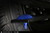 主にバン仕様のNV350に装備されるヘルパーリーフ。幾重にも重なるリーフスプリングの最下段に位置するヘルパーリーフが作動することで、積載重量に応じて効果的にレートアップを図るバリアブルレート機構が採用されています。しかし、残念ながら、特に空積載時などは唐突にヘルパーリーフが作動してしまうため、それによって引き起こされる突き上げが乗り心地を損なう要因となっているのが現状です。“ハイトダウンサポーター"は、ヘルパーリーフの前後に装着されているゴム製クッションを低反発の軟質合成樹脂パッドに交換することで、作動時のショックを緩和し、スムーズなレート変化による安定した乗り心地を実現します。薄型形状がもたらす車高のチョイ下げ(約5ミリ)効果も相まって、街乗りNV350には絶好のアイテムです。