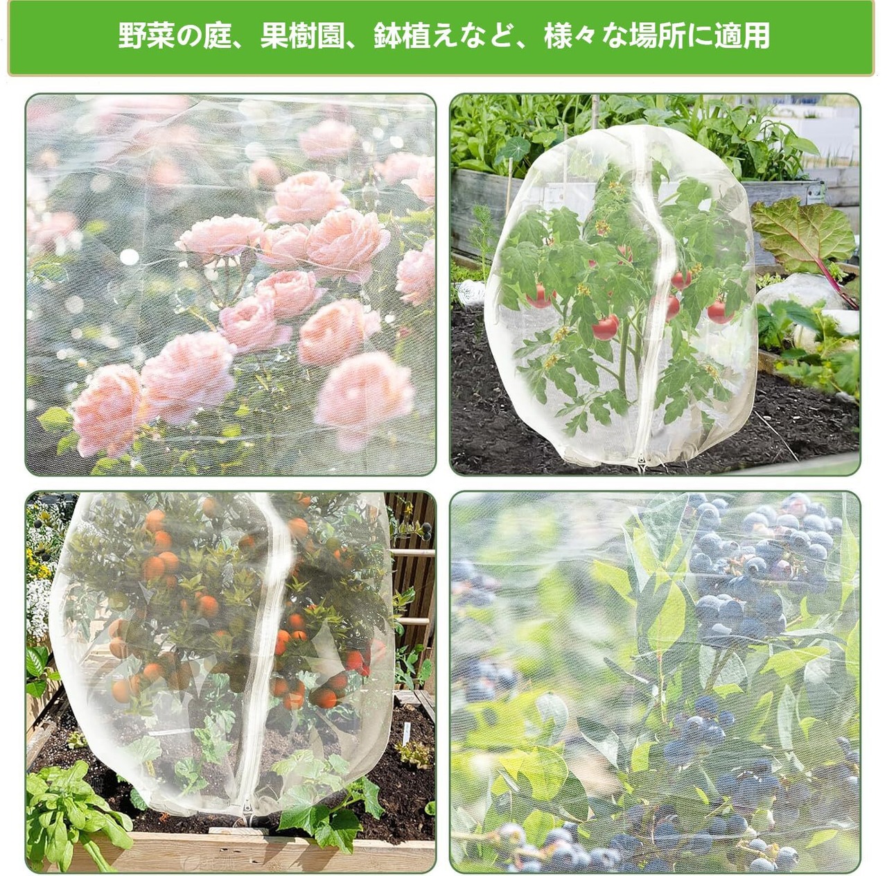 【幅広い用途 】野菜の庭、果樹園、バルコニーの鉢植えなど、様々な場所で使える植物保護カバー。鳥や害虫、ウサギなどの噛み付きから植物を保護します。ホワイトの色と透気性の生地で、植物の光合成と呼吸を妨げず、猛暑の日でも守ります。菜園、プランター、花壇など、多様な場所で使用でき、これらの虫除けネットはあらゆるの植物に保護を提供します。