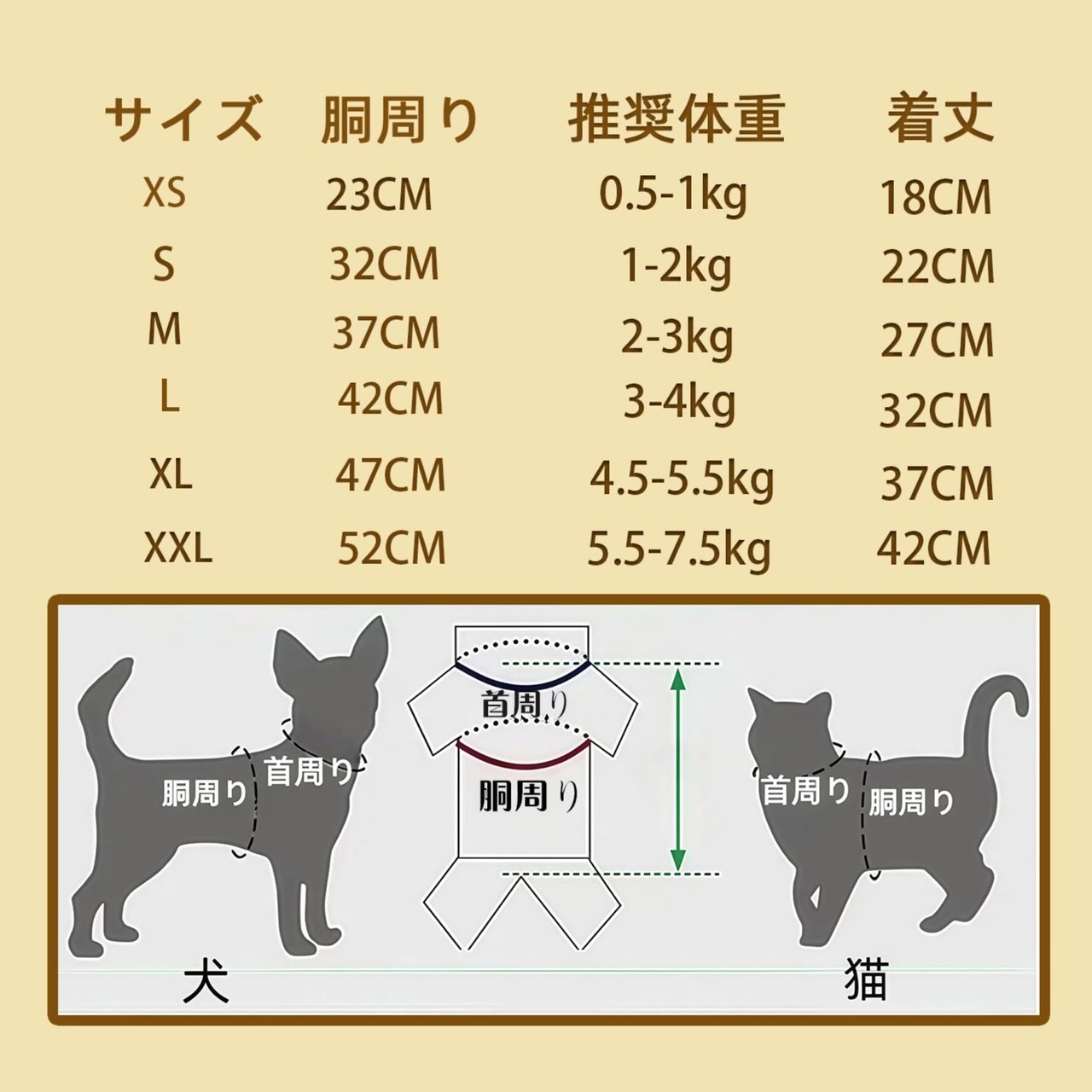 [サイズについて] XS:胴周り:23cm 着丈:18cm 。S:胴周り:32cm 着丈:22cm。M:胴周り:37cm 着丈:27cm 。L:胴周り:42cm 着丈:32cm 。 XL:胴周り:47cm 着丈:37cm 。 XXL:胴周り:52cm 着丈:42cm 。手動測定のため、衣服に1〜2cmの誤差がある場合があります。