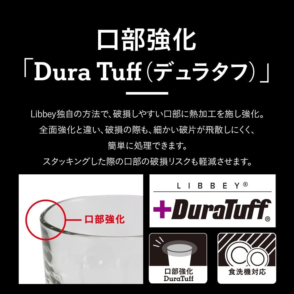 【丈夫で破損しにくい】口部強化(DURA TUFF/デュラタフ)を施したジブラルタルシリーズは丈夫で普段使いにぴったり。Libbey独自の方法で、破損しやすい口部に熱加工を施し強化。全面強化と違い、破損の際も、細かい破片が飛散しにくく、簡単に処理できます。スタッキングした際の口部の破損リスクも軽減させます。