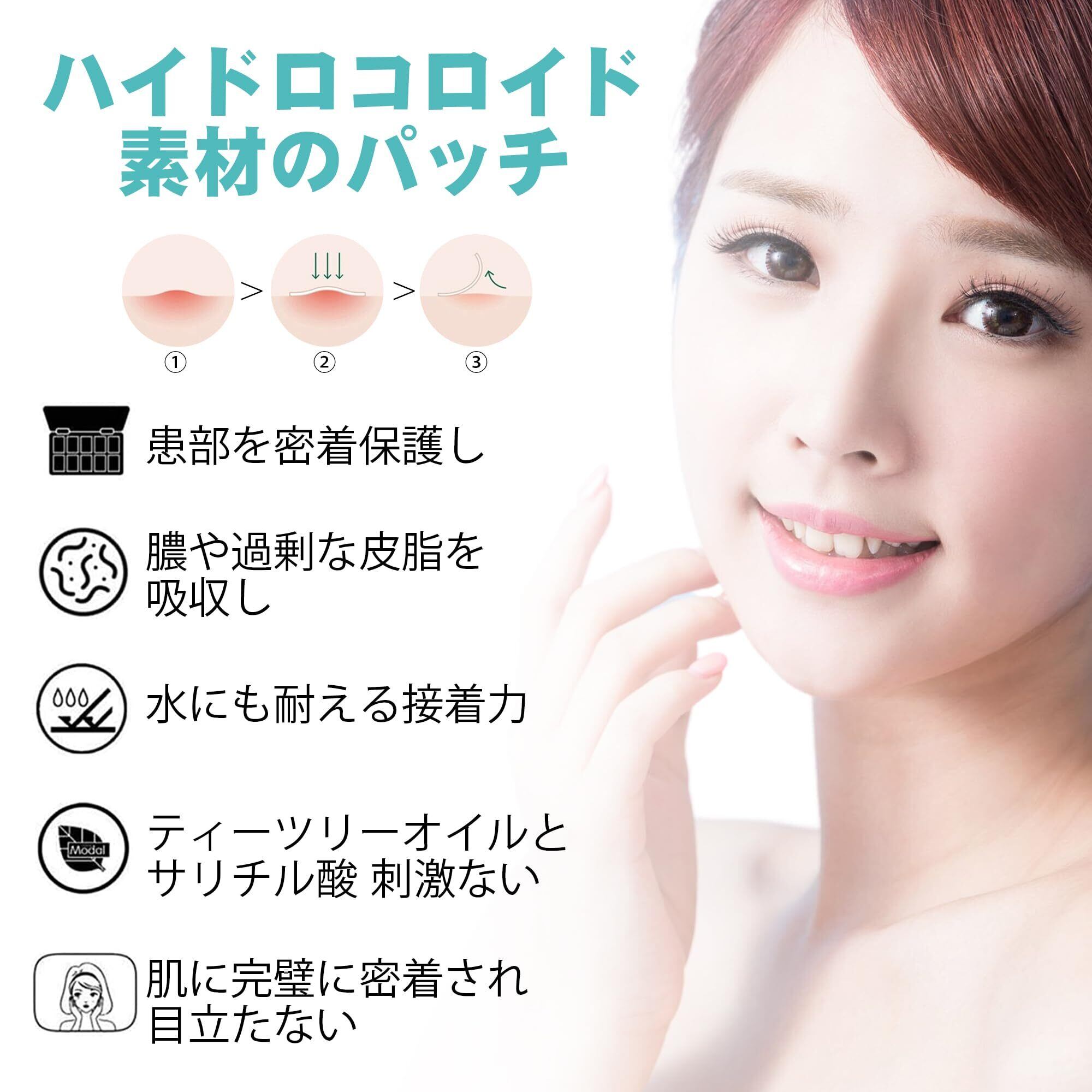 「密着保護」パッチを貼ることで、潰すことも洗いすぎることも防止し、患部を密着保護することで乾燥も防ぎます