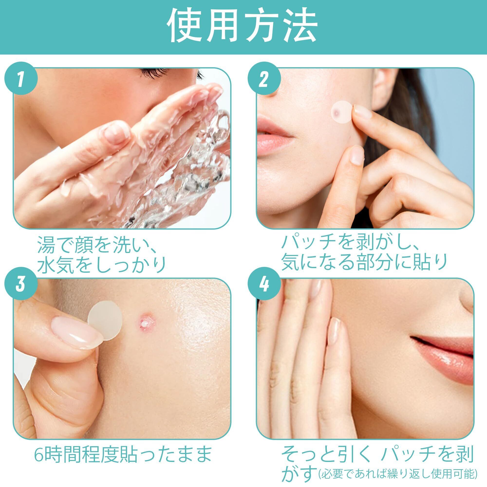 「使用方法」パッチを使用したい部分をぬるま湯で洗い、水気をしっかりとります。 このとき、パッチを貼る部分には化粧水や乳液を塗らないようにしてください。フィルムからパッチを剥がし、気になる部分に貼ります。6〜8時間ぐらい貼ったままにして下さい。パッチを剥がす時は、そっと引くように剥がしてください