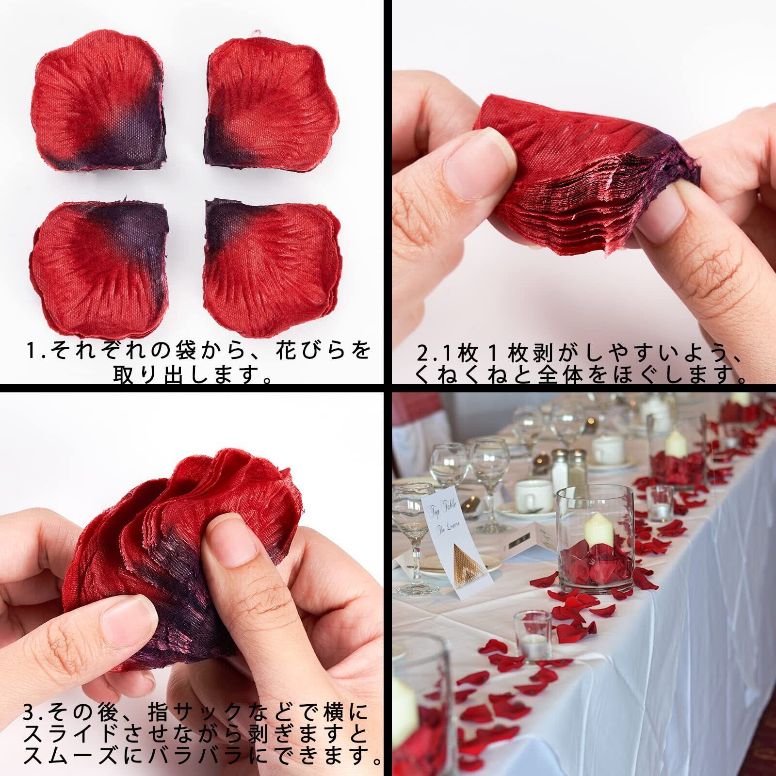 【适用范囲】:プロポーズ、結婚式、結婚記念日、キャンドルライトディナー、お祝い、パーティー、演出、写真撮影、披露宴、二次会、誕生日、イベント、デザートテーブルと他の特別な休日の装飾に適した花の装飾。イベント後に再利用することができる。これらの花びらをベッド、テーブル、ウェディング通路に散らす新婚夫婦を花弁でシャワーする。さらに、これらの花びらを心臓の形にすることによって、告白することもできる。