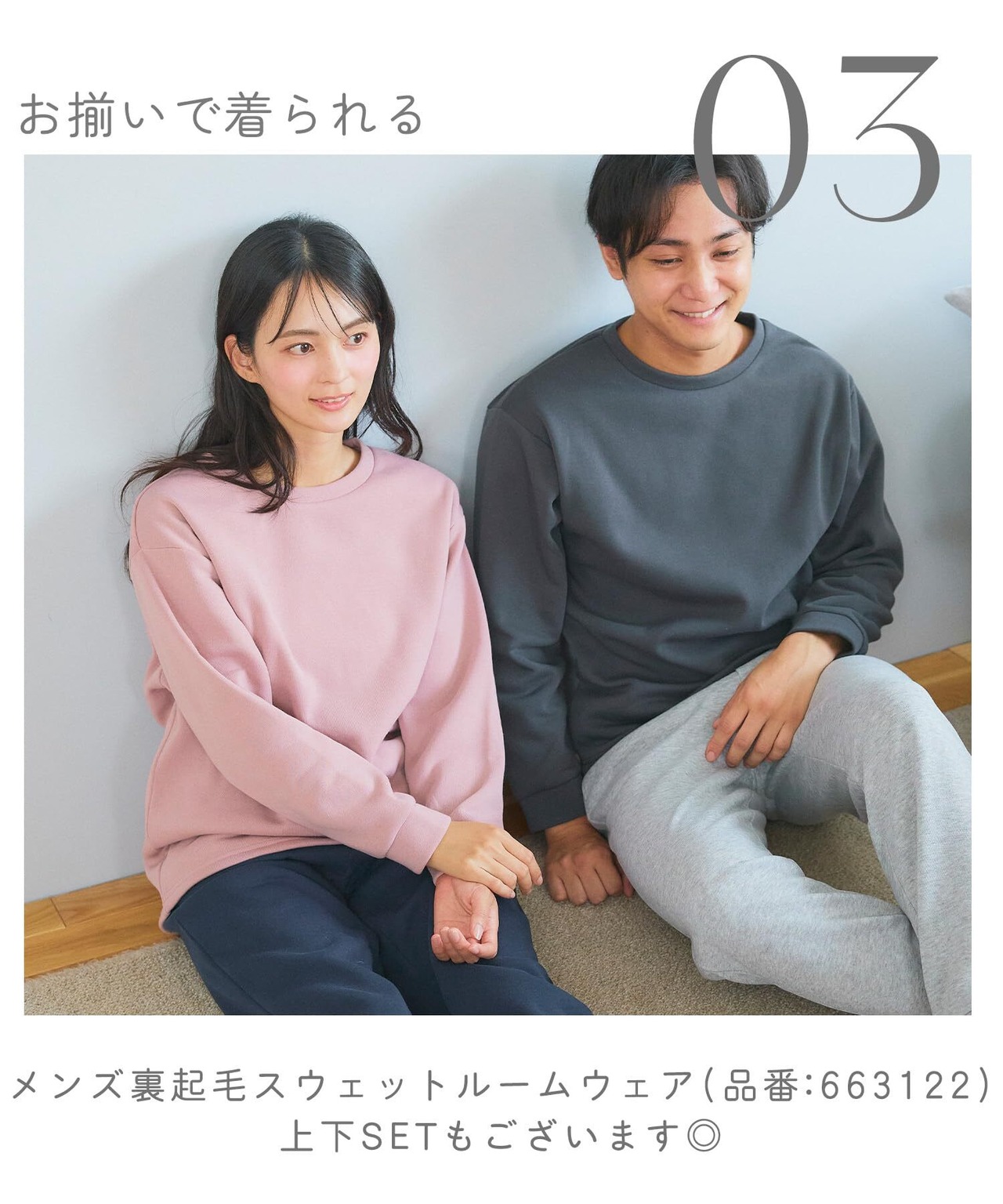 ●軽くて、あたたかい ふわふわなのにとても軽くて着心地抜群。 ストレッチ感のあるやわらか素材で楽ちんです。 家でも外でも快適!デイリーユースもできるルームウェア。 ベーシックな形で家でも外でも使いやすいです。 アウトドアコーデにもワンマイルコーデにもお出掛けコーデにも。 ●こだわりのシルエット 袖繰りを広くしたことでゆったり感をプラス。 袖口もゆったりできつくない。 パンツも裾をゆったりしたことで動きやすさもぐんとアップ! ●豊富なカラーとサイズバリエーション 10種類のバリエーション サイズはMサイズから3Lサイズまで。 親子のお揃いルームウェアにもおすすめです。 ペアで一緒に着れる、 品番:663122 メンズ裏起毛スウェットルームウェアSETもございます◎