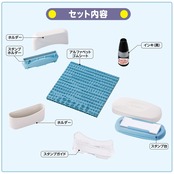【セット内容】ホルダー、スタンプホルダー、ホルダーキャップ、スタンプガイド、ゴムシート、スタンプ台、インク(黒)