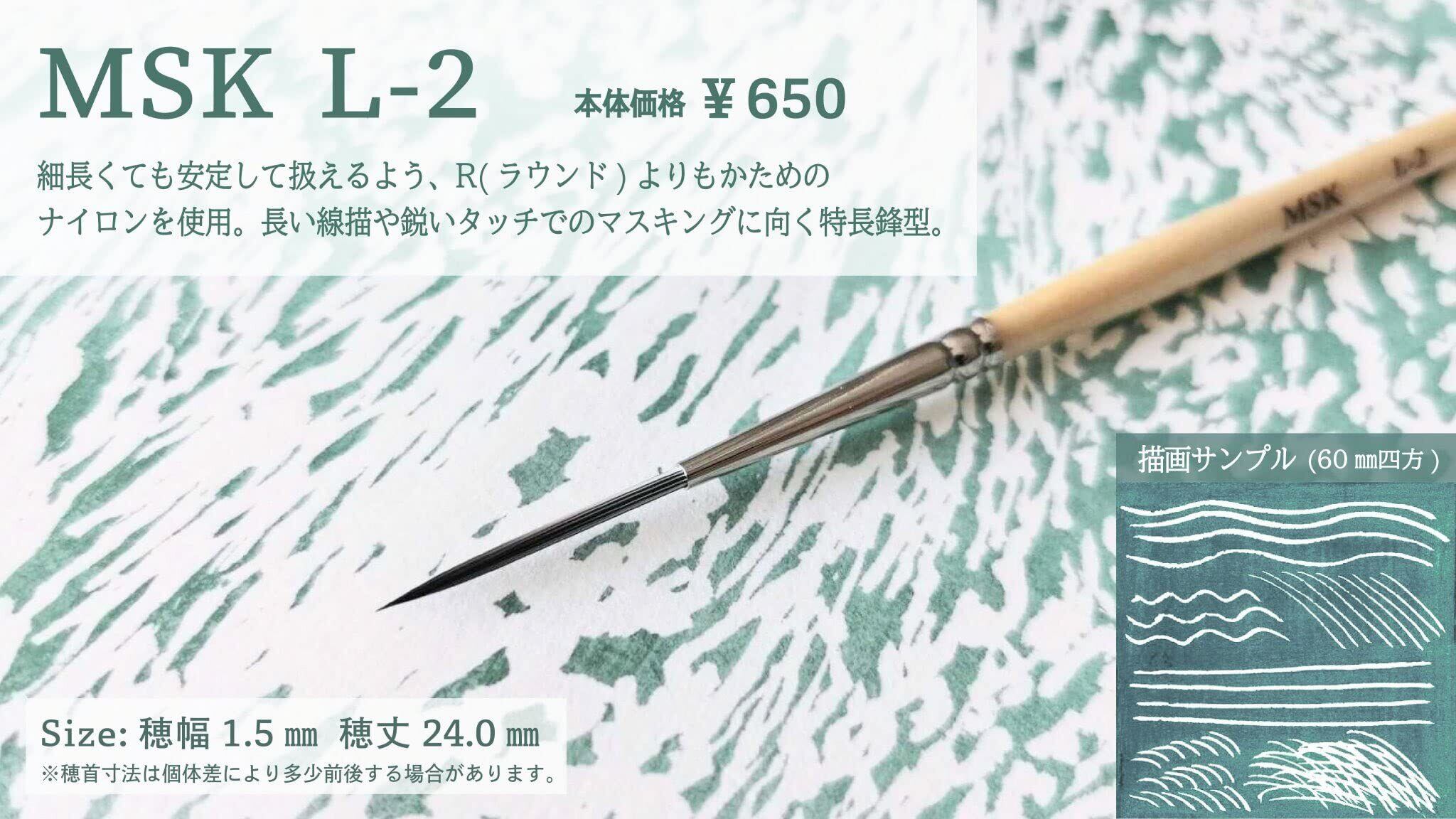 丁寧なマスキングを可能にする“繊細な描き味”と、筆への負荷が大きいマスキングインクでの使用を快適にする“耐久性・ケアの容易性”を併せ持つナイロン筆。マスキングだけでなく、水彩筆としても使用できます。