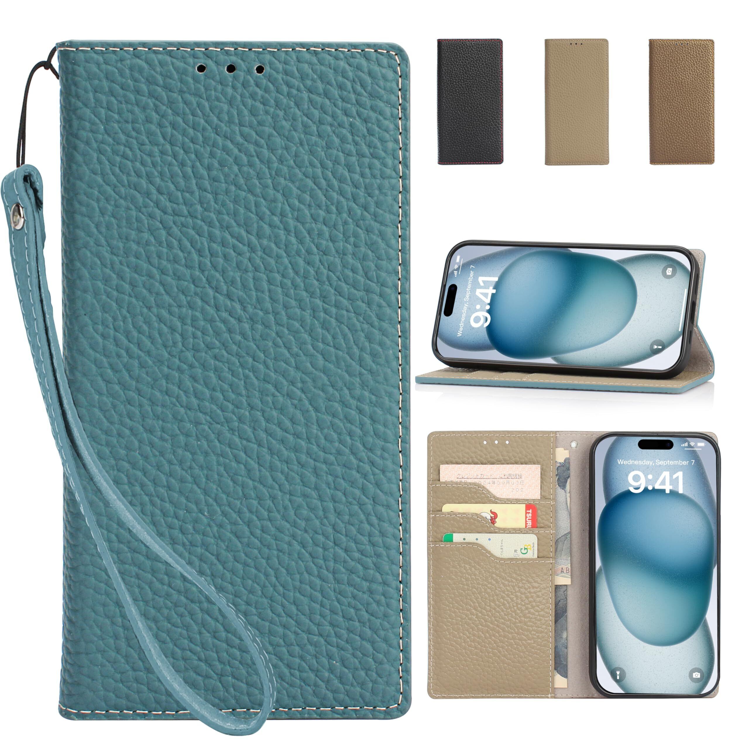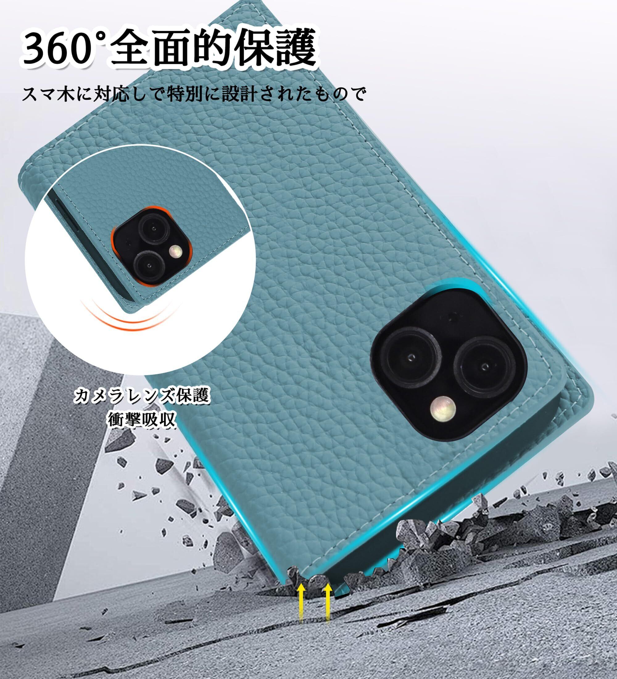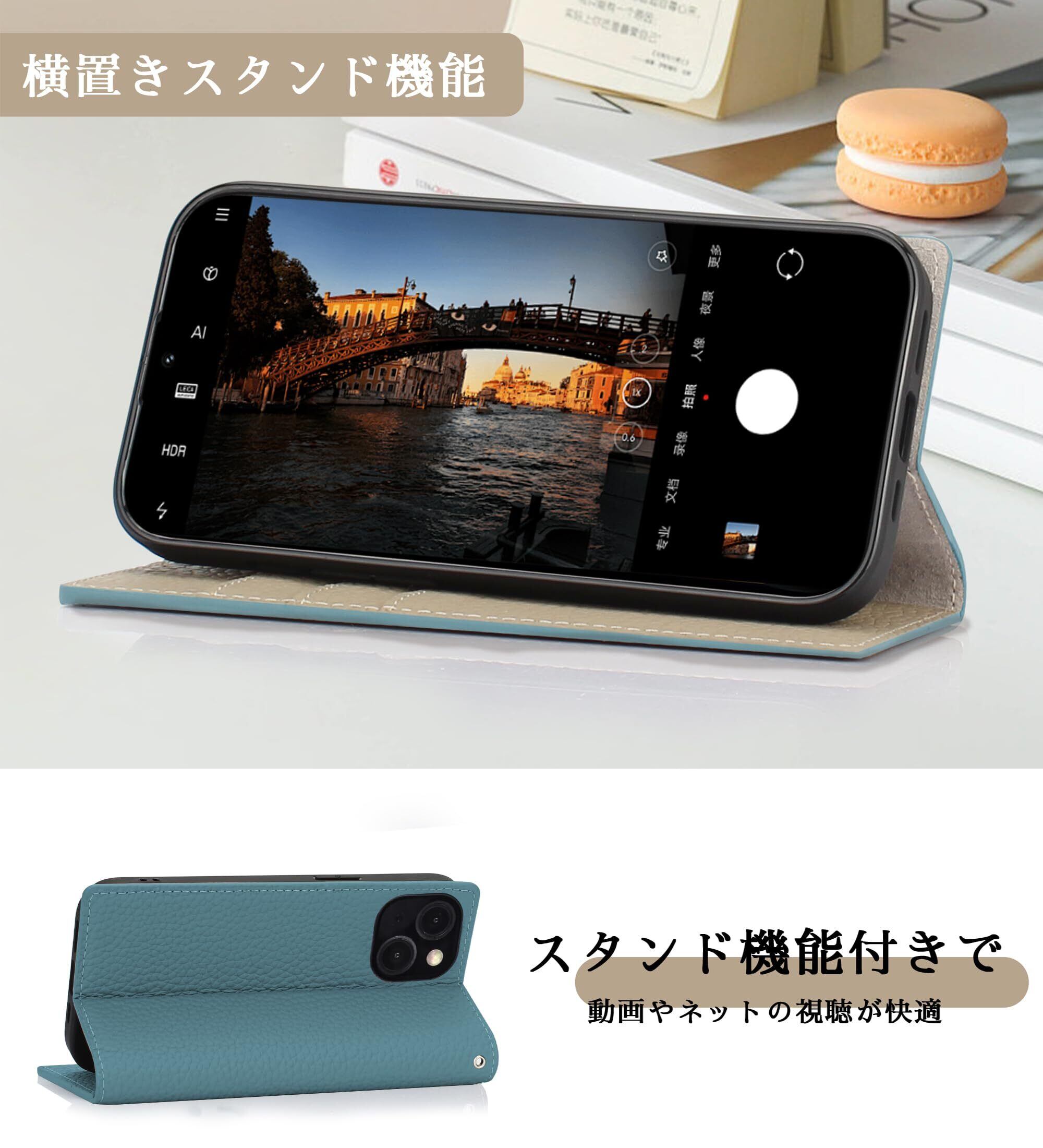 iPhone15 対応ケース 高級牛本革ケース 手帳型 アイフォン15 対応 カバー 本革 レザー いPhone15 カバー スタンド機能 ストラップ付き マグネット式 カードポケット ブルー×グレー