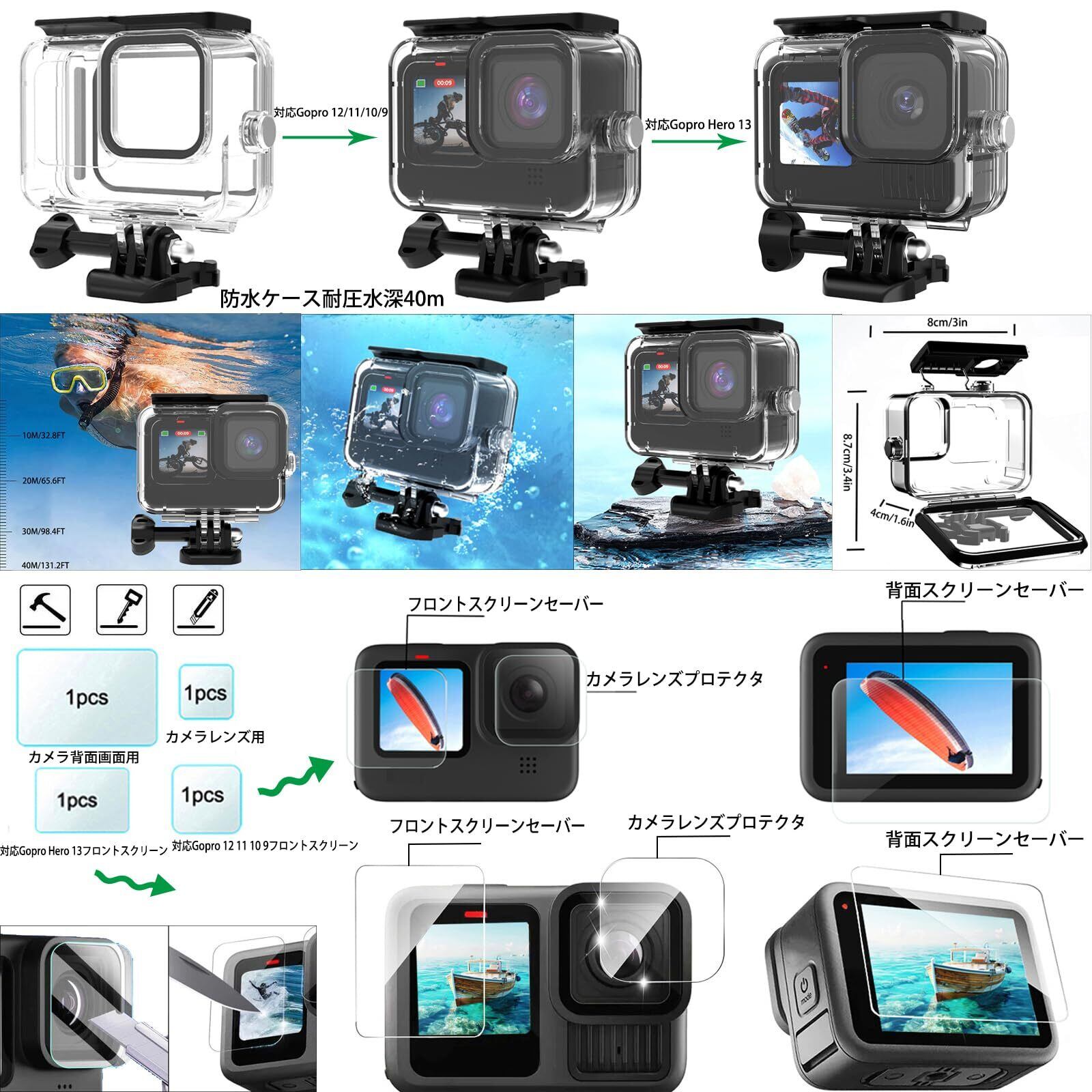 【対応Gopro Hero 13/12/11/10/9専用防水ケース耐圧水深40m+スクリーン保護フィルム保護セット】防水ケース に通じをつける 耐圧試験、防水試験、高透過率の鋼化ガラスを、水深40mにも素晴らしい瞬間をキャプチャすることができます。最高の画像鮮鋭度をできます。スクラッチング、衝撃、塵などを避けて、最大の保護を提供します。水中撮影用以外にも保護ケースとしては使えます .レンズとスクリーン保護フィルムセットは、高衝撃の落下、傷、ほこり、水、油などの損傷からカメラのスクリーンとレンズを保護する。