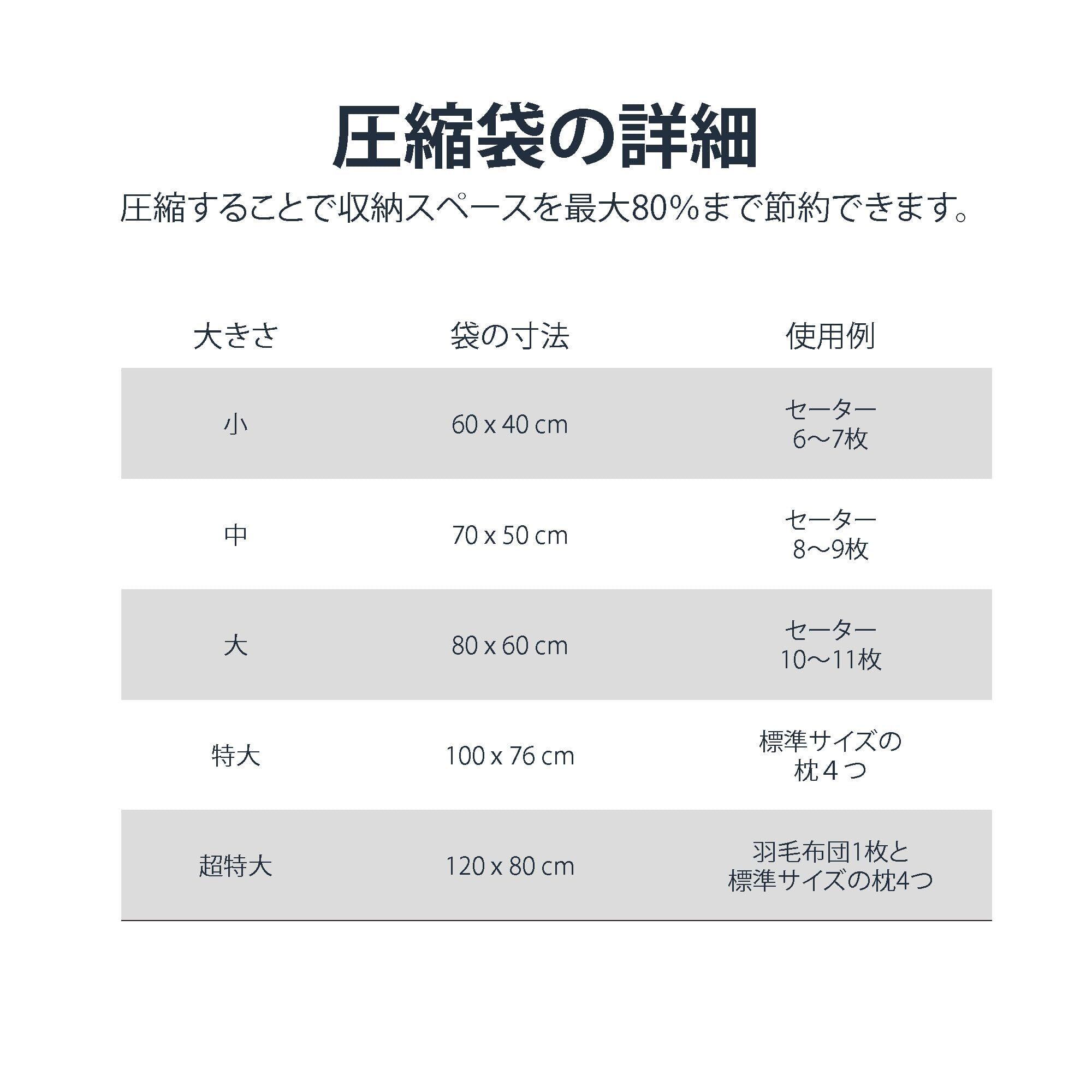 かさばりがちな布製品を最大80%圧縮してコンパクトにベッドの下、クローゼット、食器棚、またはスーツケースに収納してスペースを節約