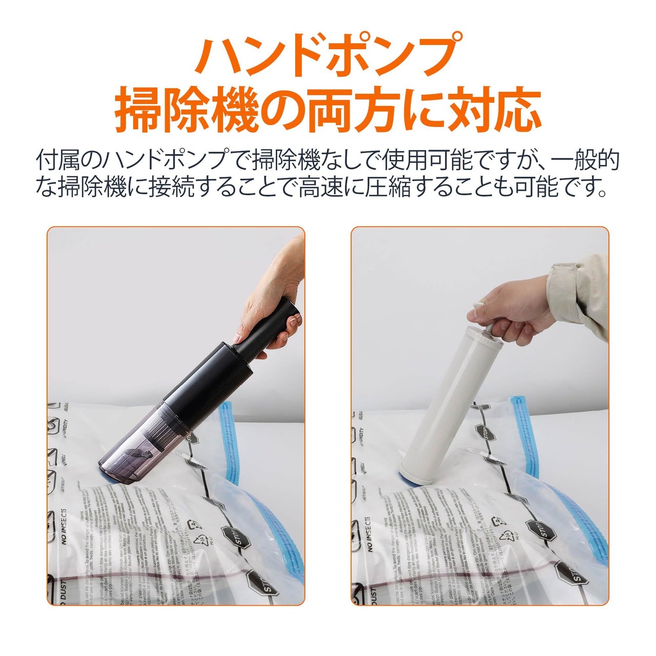 付属のハンドポンプで掃除機なしで使用可能。一般的な掃除機に接続することで高速に圧縮することも可能