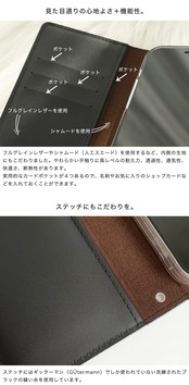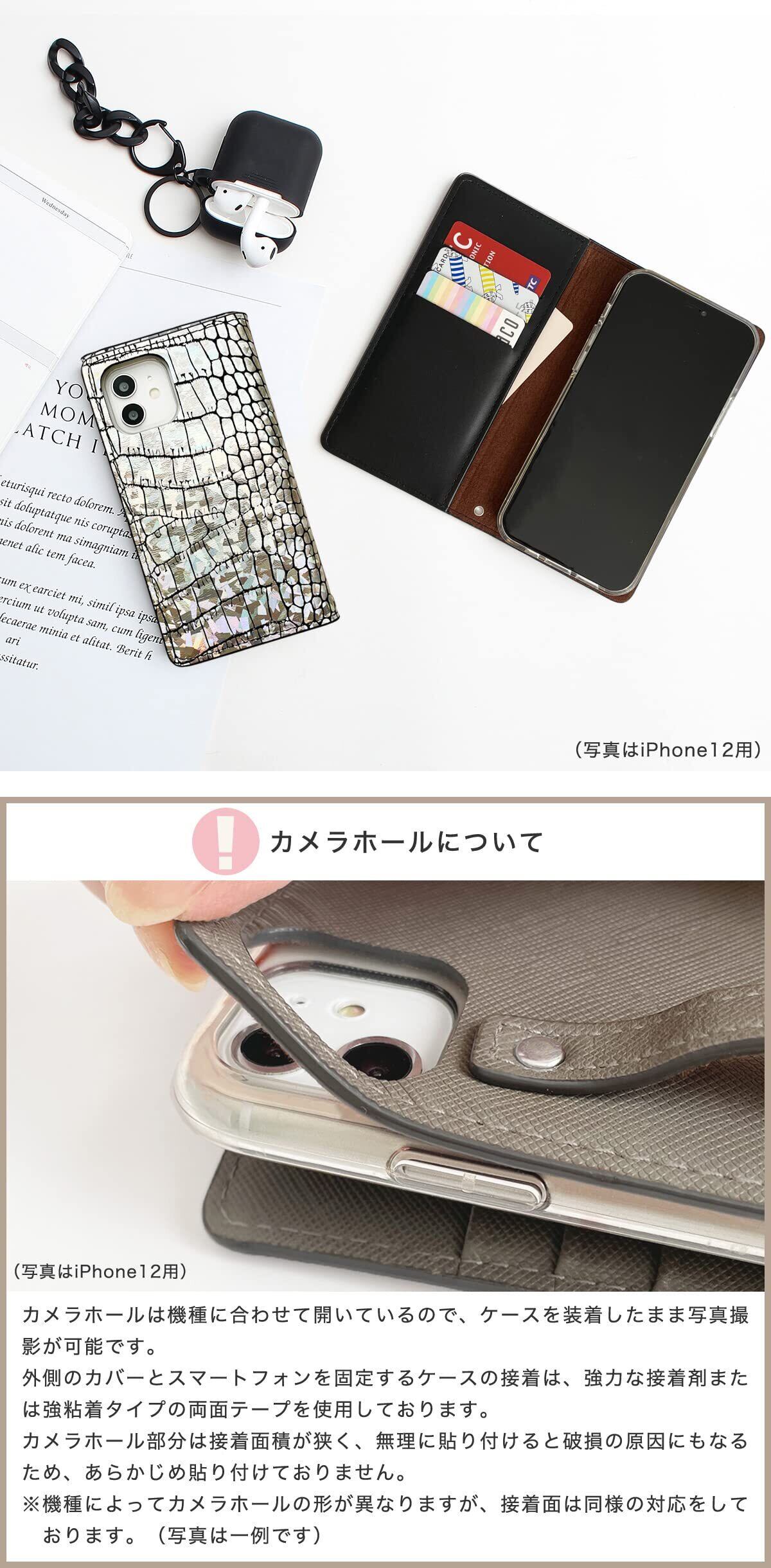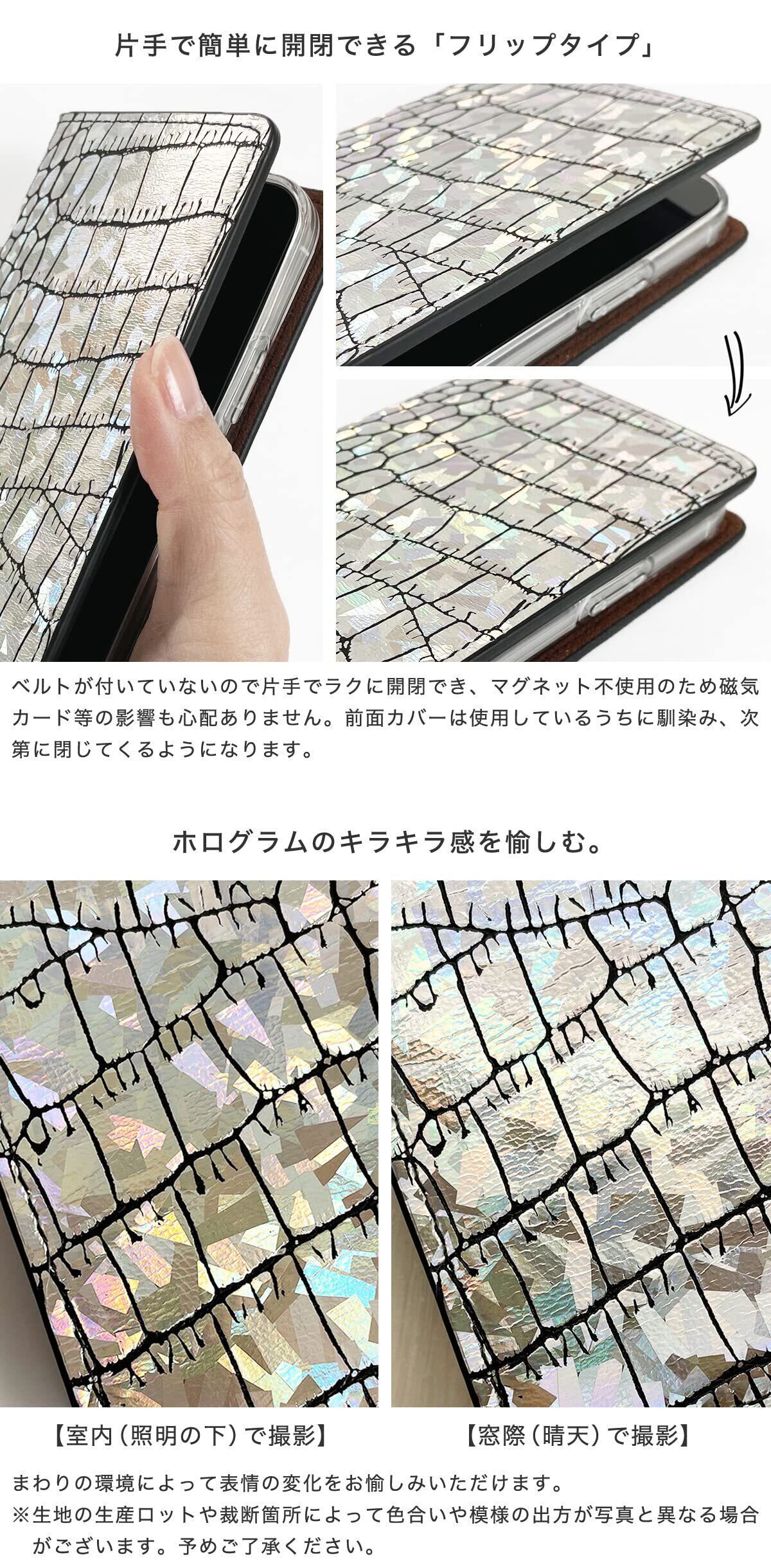 【素材】本体(外側) : 牛革(牛皮をクロムなめしした皮革)にホログラムとクロコダイル模様を転写した皮革 カードポケット : フルグレインレザー(牛皮革) 本体(内側) : シャムード(人工スエード) 内側ケース : PC(ポリカーボネート)またはシリコン ステッチにはドイツの手芸糸老舗メーカー「ギッターマン(GÜtermann)」の縫い糸を使用。※仕入れる生産ロットや裁断箇所により、色合いや模様の出方が若干変わる場合がございます。「イメージと違う」など初期不良以外での返品・交換はご遠慮いただいております。予めご了承ください。