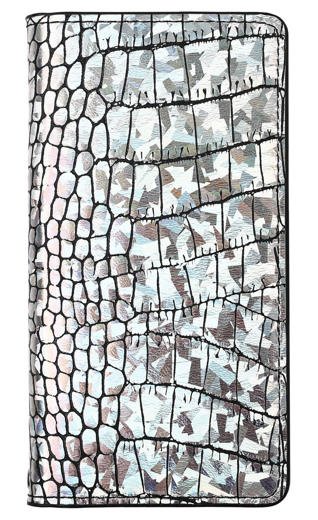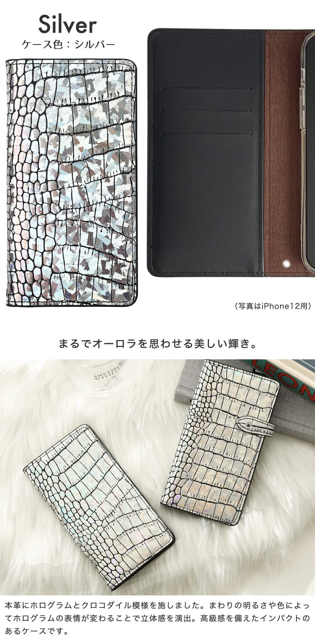 iPhone 15 ケース 本革 ホログラム クロコダイル模様 ワニ柄 スマホケース 手帳型 スマホ カバー カード入れ ベルトなし マグネット不使用 ストラップホール (iPhone15, シルバー) | impsmile