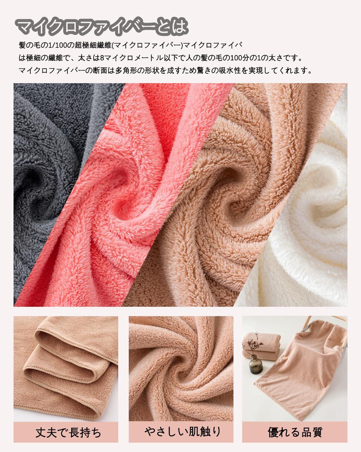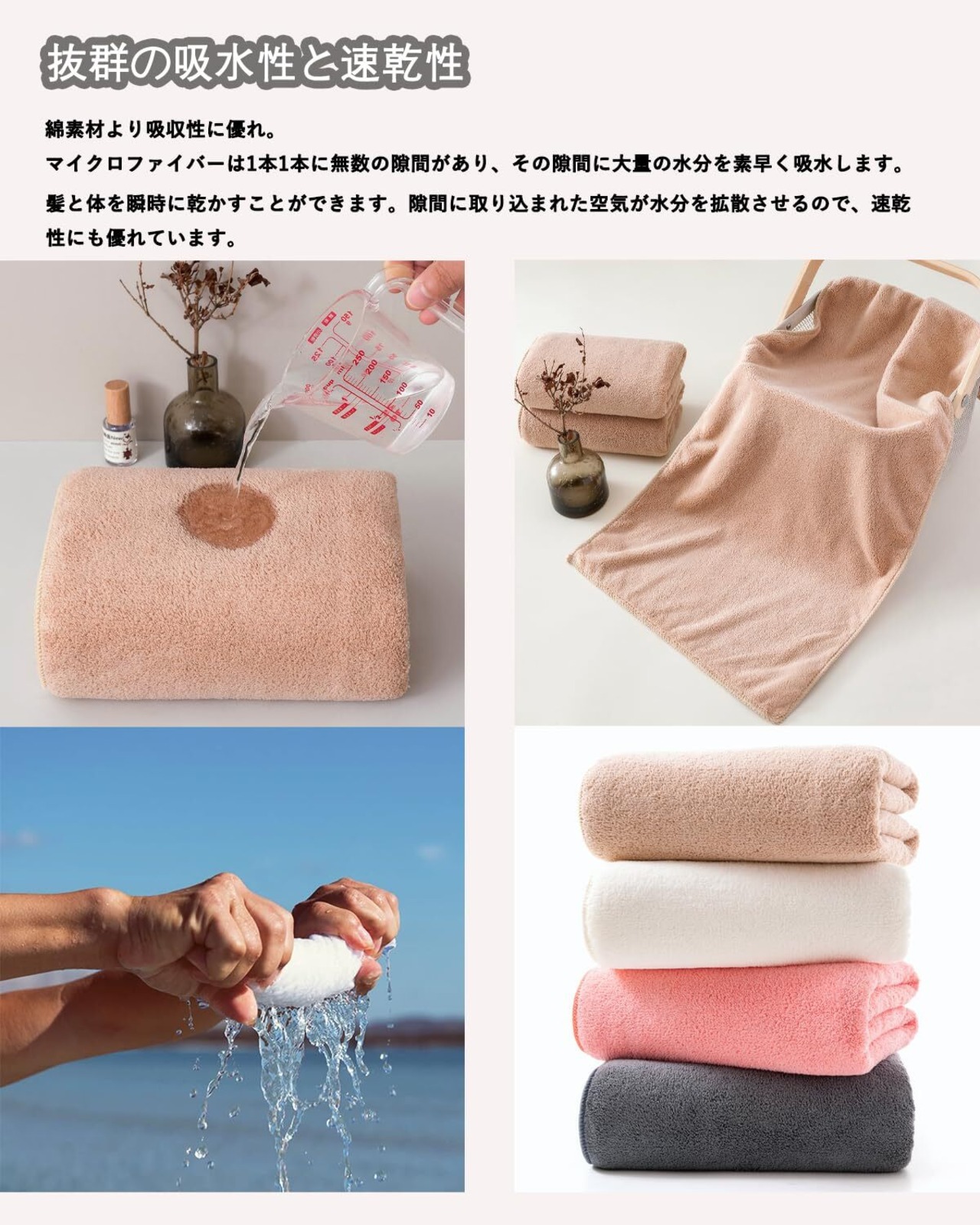 【抜群の吸水性と速乾性】綿の素材より吸水性が優れます。マイクロファイバー素材の表面は数えられない隙間があり、その隙間に大量の水分を素早い吸水できます。髪や肌にそっと当てるだけで水分が吸収される素材であり、また汚れも落としやすい特徴があります。隙間に取り込まれた空気が水分を拡散させるので、速乾性のポイントで、バスタオルの雑菌を抑え、健康を保つことができます。