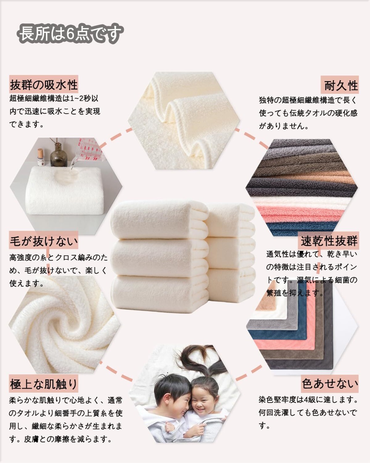 ●【豊富なセット内容】6枚セットだから、家族や友人と一緒でも安心。洗い替えにも便利で、家族のバスタオルとして大活躍します!